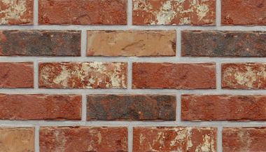 The Big Horn Modular brick, manufactured by Hebron Brick Company is a extruded Brick and red in colour with a light texture with flashed, face creases/dimpled, orange shading and slurry (white coating).
