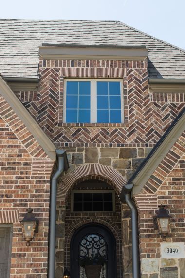 The Cromwell Thin Corners King brick, manufactured by Commercial Brick Company (CBC) is a extruded Brick and red in colour with a heavy texture with face creases/dimpled, hearting, white powder flash, flashed, tumbled, orange shading, slurry (white coating) and tan/gray shading.
