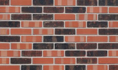 The Black Hills Thin Standard brick by McNear Brick & Block is red-orange with a hard flack flashed brick and sone pink cross hatches and a tumbled edge. Actual dimensions 2.45 x 8.125 x .625D.