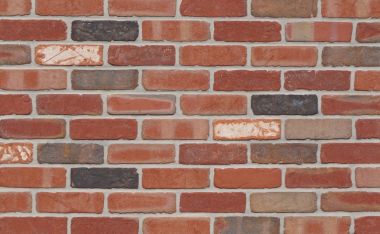 The Farmingdale Thin Standard brick by McNear Brick & Block is red with deep orange, tan, and black flashing and also has some slurry in the range. A waterfall texture with a fine sand finish and tumbled edges help to give this brick an old used brick appearance.