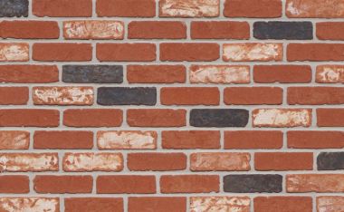 The Portland Thin Standard brick by McNear Brick & Block is red with white slurry and black brick for flashing and a waterfall face with a fine sand coating for texture. The tumbled edges make this brick an instant classic.